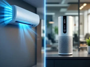 Een mobiele airco werkt door warme lucht uit je kantoor op te zuigen, deze te koelen via een koelcircuit met compressor en condensor, en vervolgens koele lucht terug te blazen. De warme lucht wordt via een afvoerslang naar buiten geleid.
